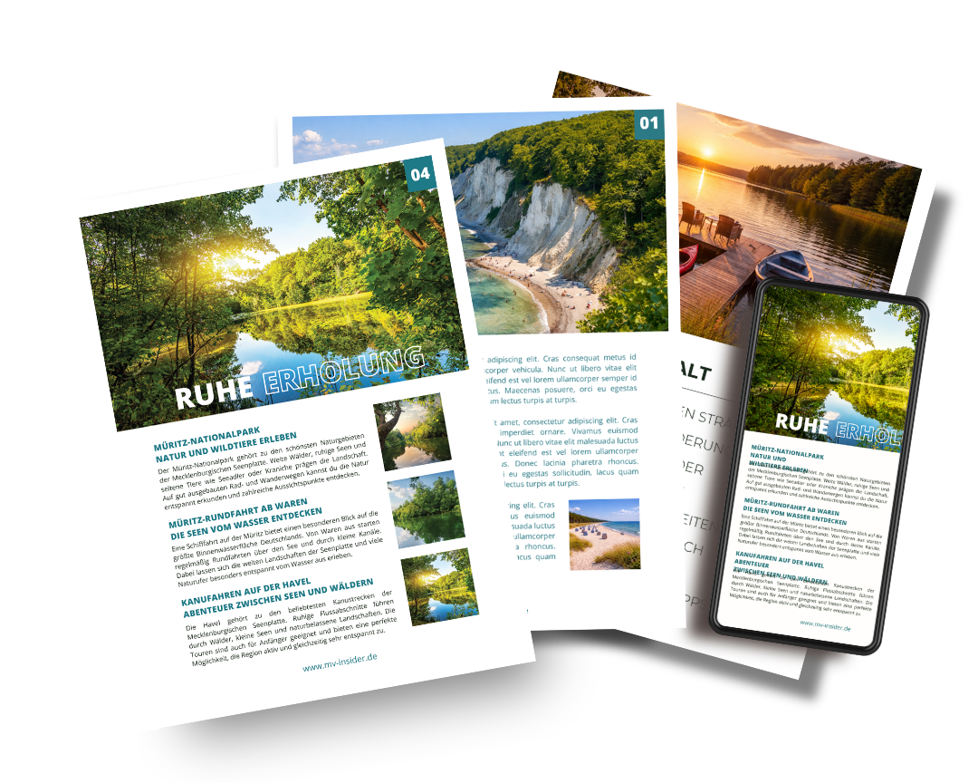 Dieser Guide zeigt dir die schönsten Badestellen, Aussichtspunkte und Ausflüge rund um Müritz, Fleesensee und Plauer See. Ideal für entspannte Tage am Wasser.